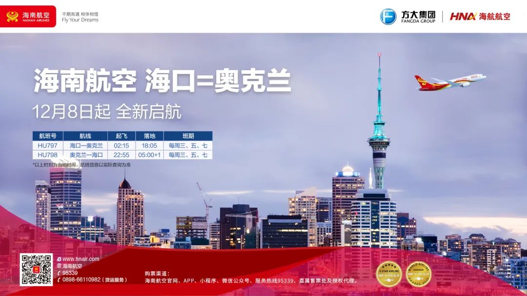 海南航空计划于12月8日起新开海口—奥克兰国际航线,这是海南航空近期在海口又一重要航线布局,也是海口首条直飞新西兰的国际航线。该航线作为海南省开通的首条通往新西兰航线,将对海口、奥克兰两地的经济发展、人文交流起到积极的促进作用。这是海南航空继海口—悉尼、海口—墨尔本、深圳—奥克兰航线后的第四条直飞大洋洲的航线,也是海南航空在海口出港的第八条国际及地区航线,搭建起海南通往大洋洲的便捷桥梁。