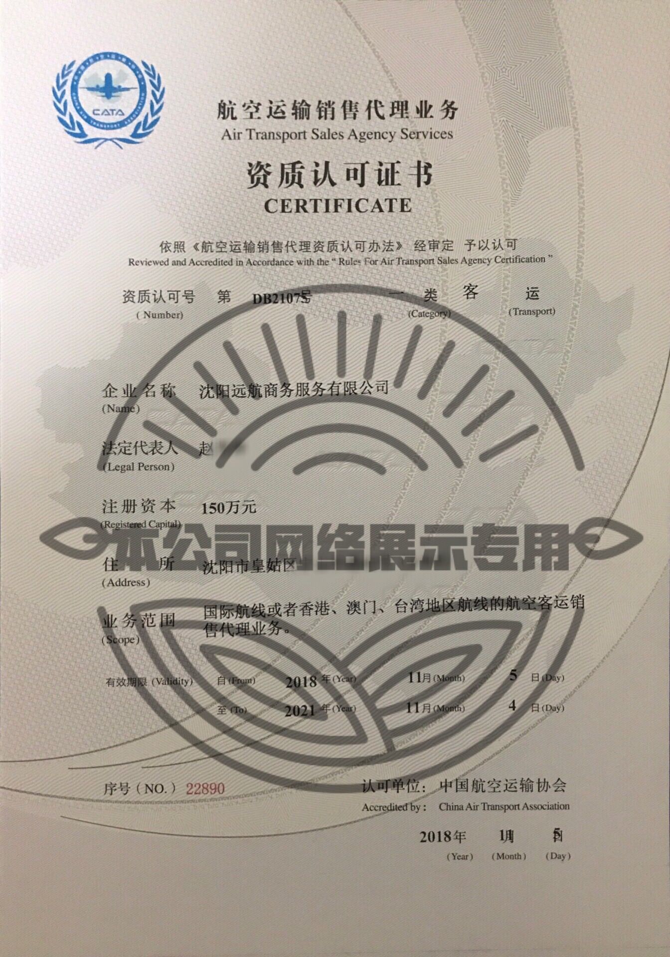 为响应中国航协整顿代理市场的号召,为您更好地提供服务,本司已成功更新为新版资质,新版资质号为DB21075,登录中国航协官网,输入信息即可查证。